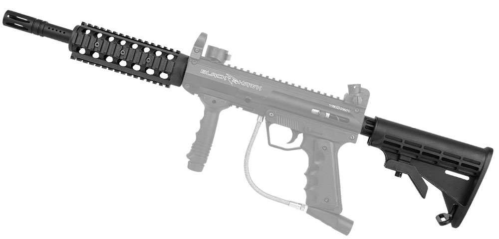 Das Upgrade Kit für die Valken SW-1 Blackhawk enthält einen Whiskey-Shroud inklusive Befestigungsmaterial, einen verlängerten Lauf und eine taktische Schulterstütze.
